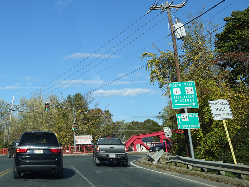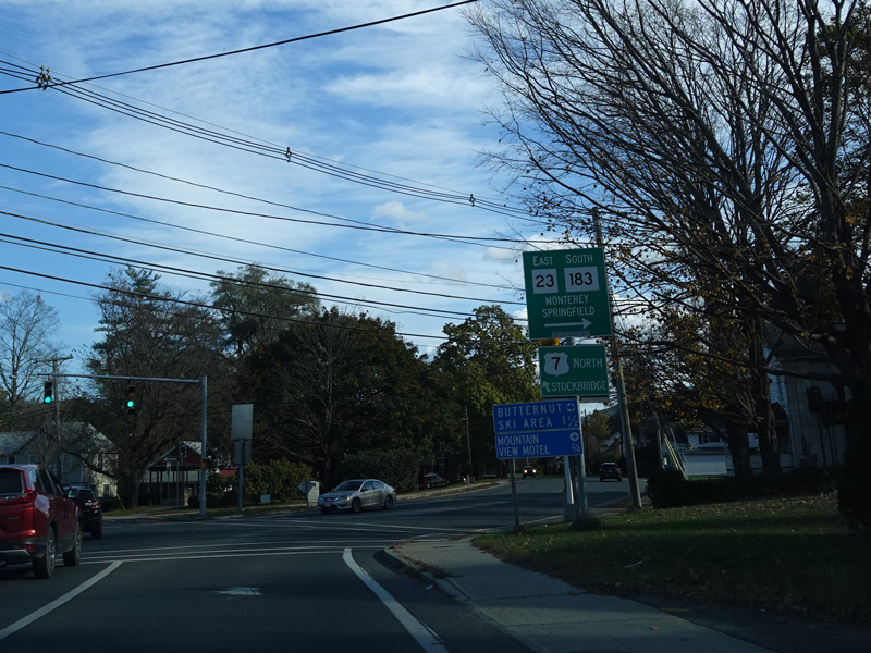 The two routes split at a traffic light. Bear left onto Stockbridge Road to stay on US 7. Bear right to stay on State Road for MA 23/MA 183.