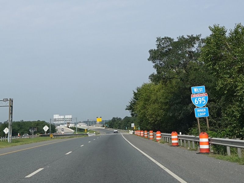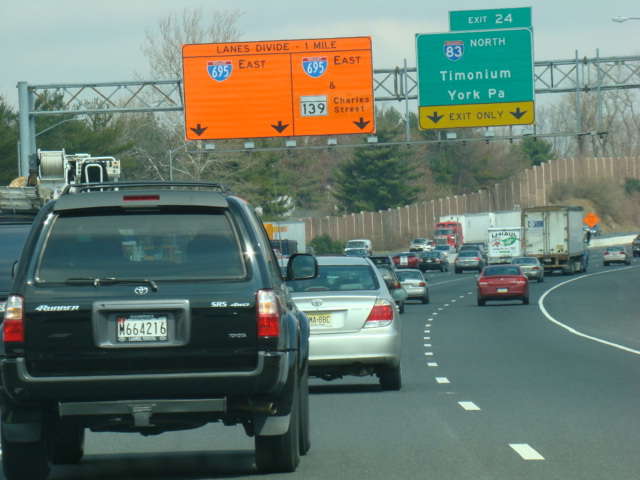 Northbound I-83 is multiplexed with eastbound I-695 for one exit here. The two routes then split. Exit 24 is for the Baltimore-Harrisburg Expressway (I-83) north.