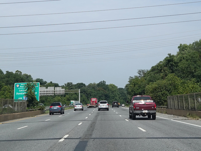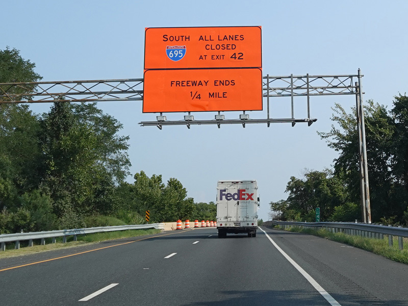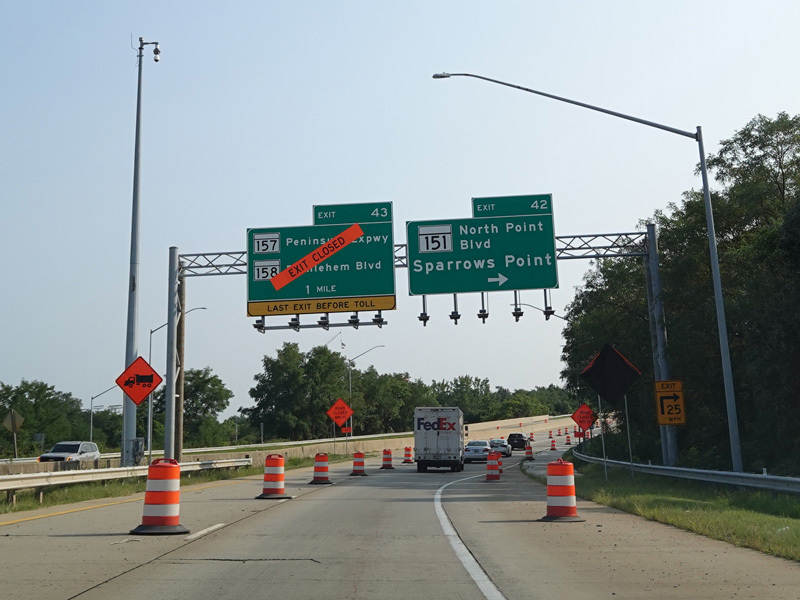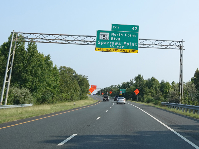 Exit 42 is for North Point Boulevard (MD 151). The Baltimore Beltway is closed ahead as a result of the collapse of the Francis Scott Key Bridge. All vehicles must exit here.