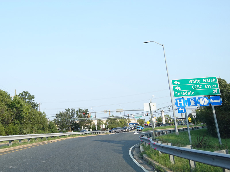 The ramp for exit 42 from southbound I-695 splits. Bear left to go north on North Point Boulevard (MD 151) or right to go south.