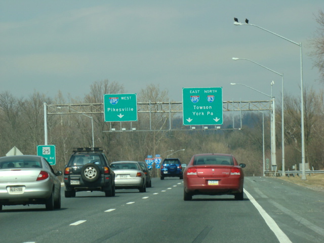 I-83 is a major north/south highway in Maryland and Pennsylvania. It begins at President Street in Downtown Baltimore, near the Inner Harbor. The first section is called the Jones Falls Expressway. It runs north through Baltimore and into the northern suburbs. A short distance north of the city line, it ends at the Baltimore Beltway (I-695). Northbound I-83 is multiplexed with eastbound I-695 for one exit. The two routes then split. I-83 is called the Baltimore-Harrisburg Expressway from this point on. It continues north to the Pennsylvania border and into Pennsylvania.