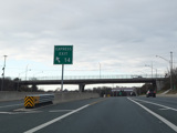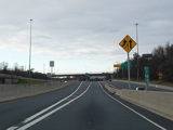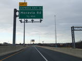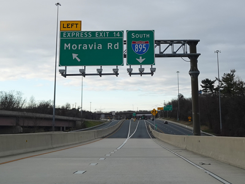 The Baltimore Harbor Tunnel Thruway begins at the John F. Kennedy Memorial Highway (I-95). The exit from the express lanes of I-95 leads into the express lane on I-895. Exit 14 is for Moravia Road. Immediately after the exit, the express lane ends and merges into the main roadway.