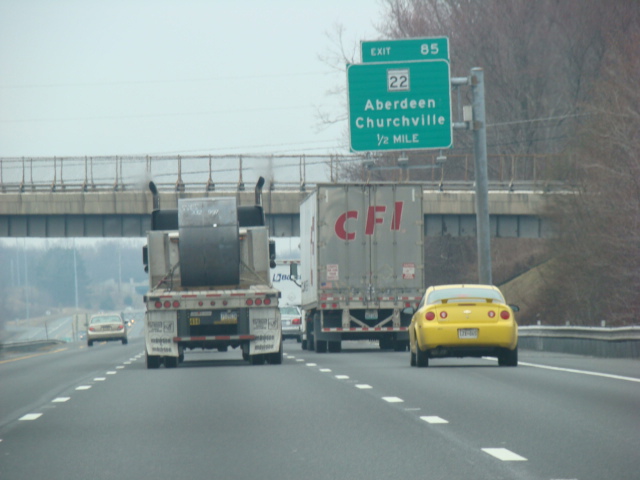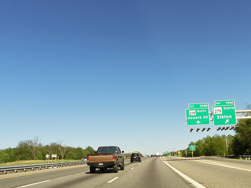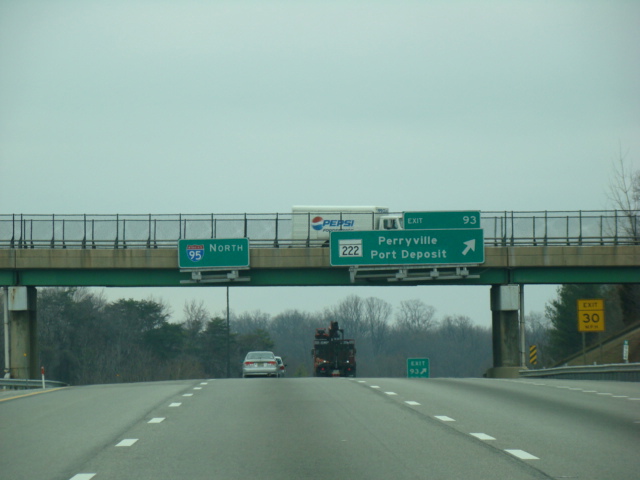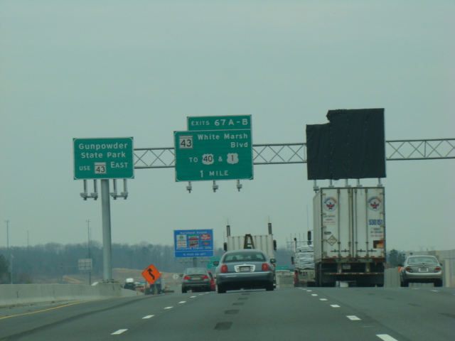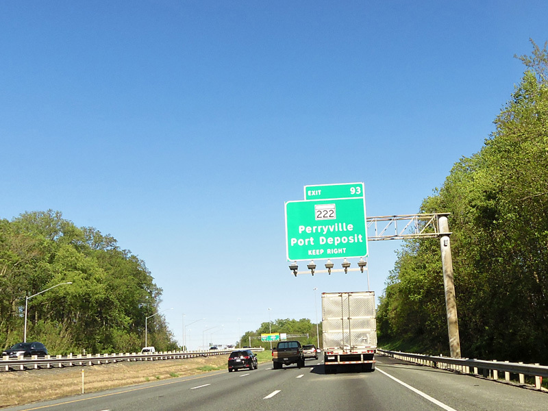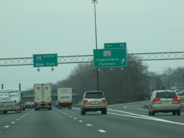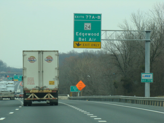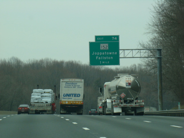 These pictures show I-95 northbound at exit 74-77 at it appeared before construction work began to extend the express toll lanes to the north. The interchange at exits 77A-B has since been reconfigured to provide access to Emmorton Road (MD 924).