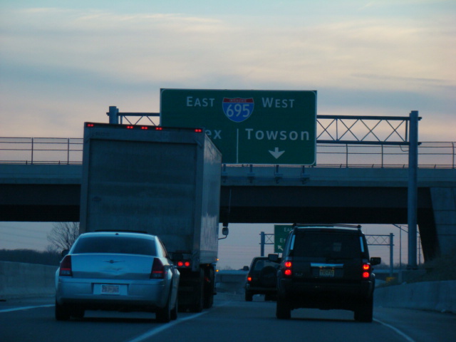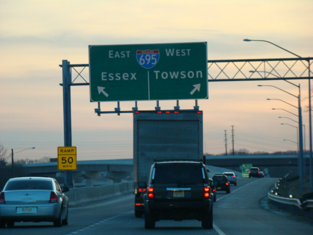 The ramp for exit 64 from southbound I-95 splits. Bear left to go east on the Baltimore Beltway (I-695) or bear right to go west.