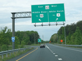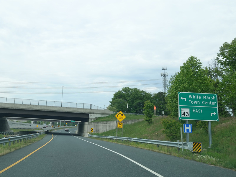 The ramp for exit 67 from southbound I-95 splits. Bear left to go east on White Marsh Boulevard (MD 43) or bear right to go west.