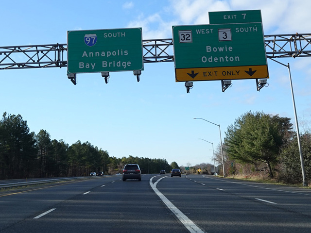 I-97 is a north/south route connecting Annapolis to Baltimore. It serves as the most direct route to the Eastern Shore from Baltimore. It begins at the John Hanson Highway (US 50/US 301) in Annapolis and runs northwest for a few miles before turning to the north. It ends at the Baltimore Beltway (I-695) in Glen Burnie. There are ramps from the northern terminus providing access to the Baltimore Harbor Tunnel Thruway (I-895), about two miles further north.
