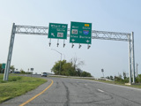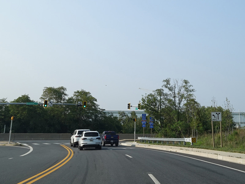 The ramp for the exit for Wharf Road splits. Bear left to go south toward Sparrows Point Boulevard (MD 151) south. Bear right to go north toward the Baltimore Beltway (I-695) and Bethlehem Boulevard (MD 158).