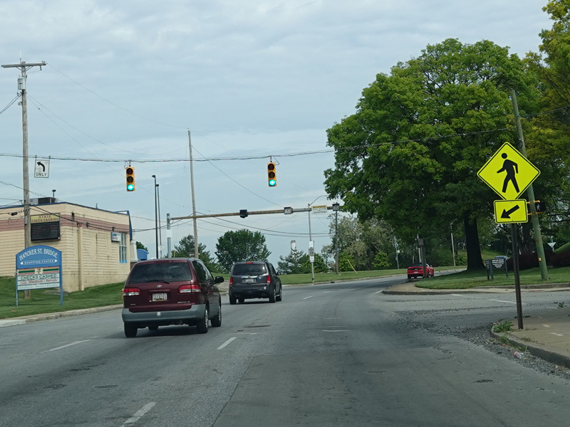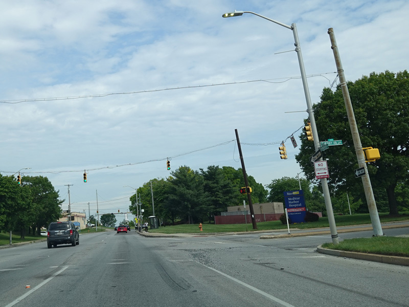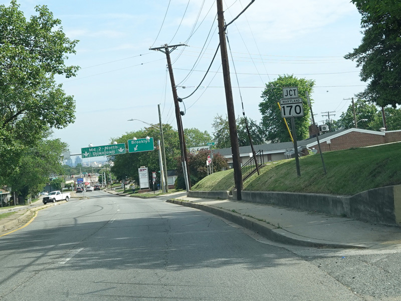 Governor Ritchie Highway ends at a traffic light. Bear left onto Potee Street to stay on MD 2. Make a hard left for Belle Grove Road (MD 170), which begins here. There is no route signage.