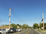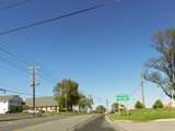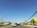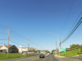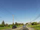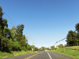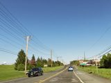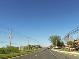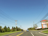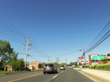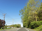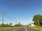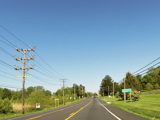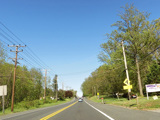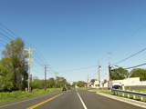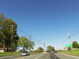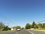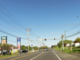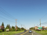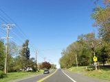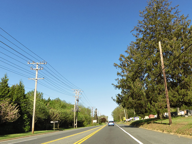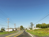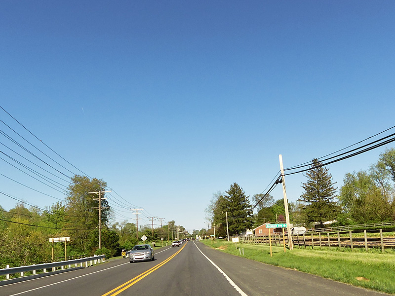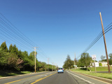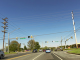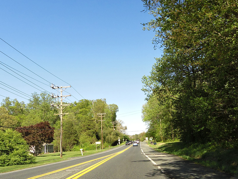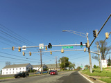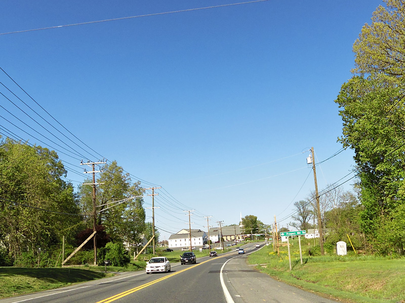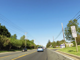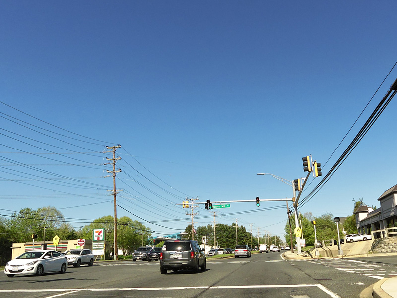 Skipping about a mile, Churchville Road runs east as a four-lane divided road with a grass median. There are traffic lights at Brierhill Road and Moores Mill Road, followed by an uncontrolled intersection at Econ Drive and Hillside Drive.