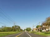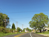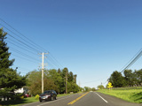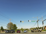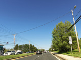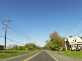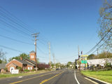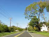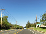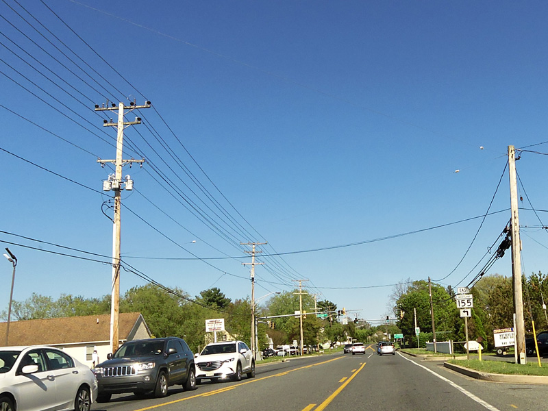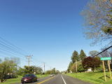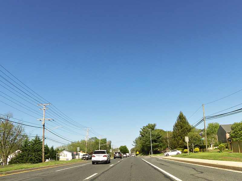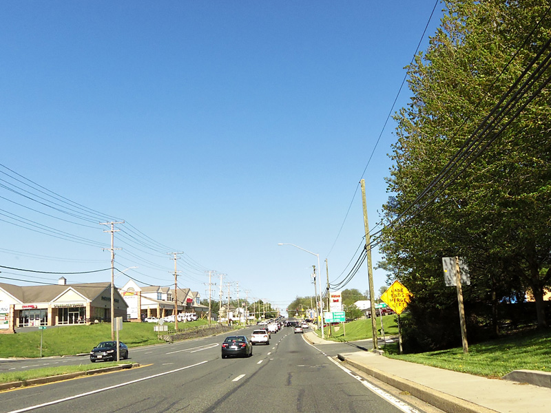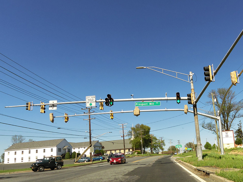 The median ends. Churchville Road narrows down to two lanes and continues east. There are traffic lights at Prospect Mill Road, Thomas Run Road, and Schucks Road.