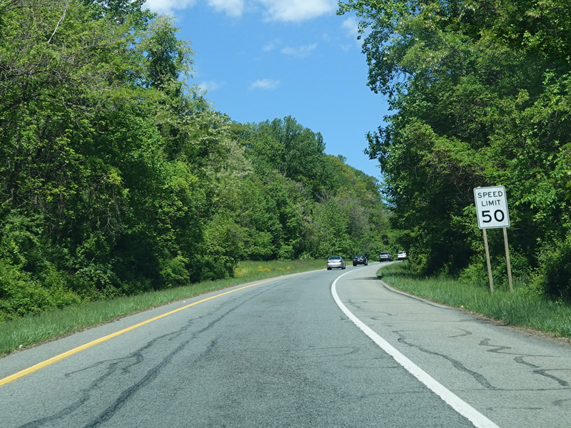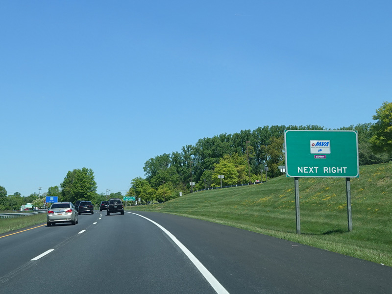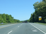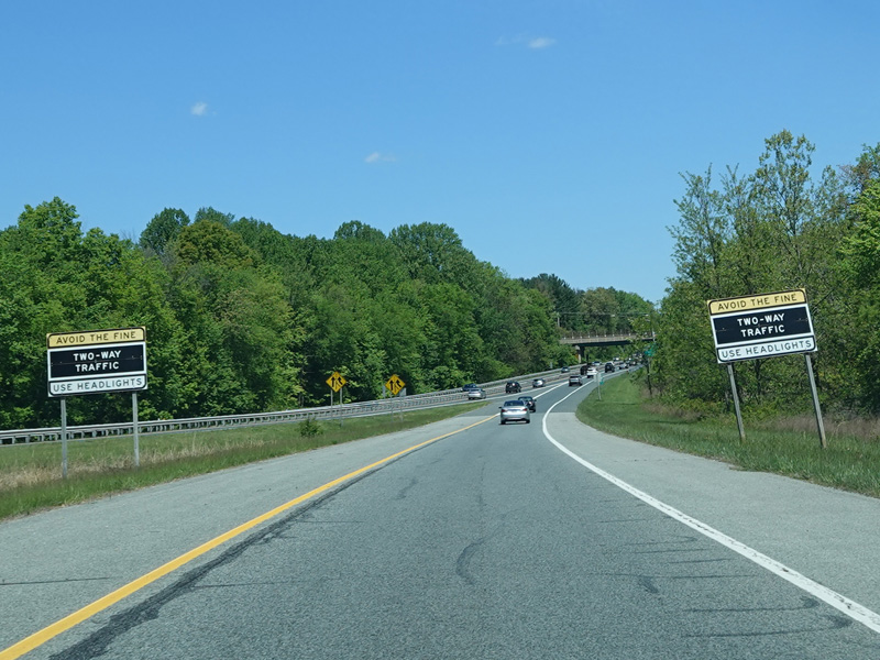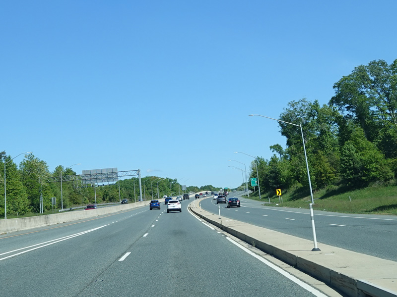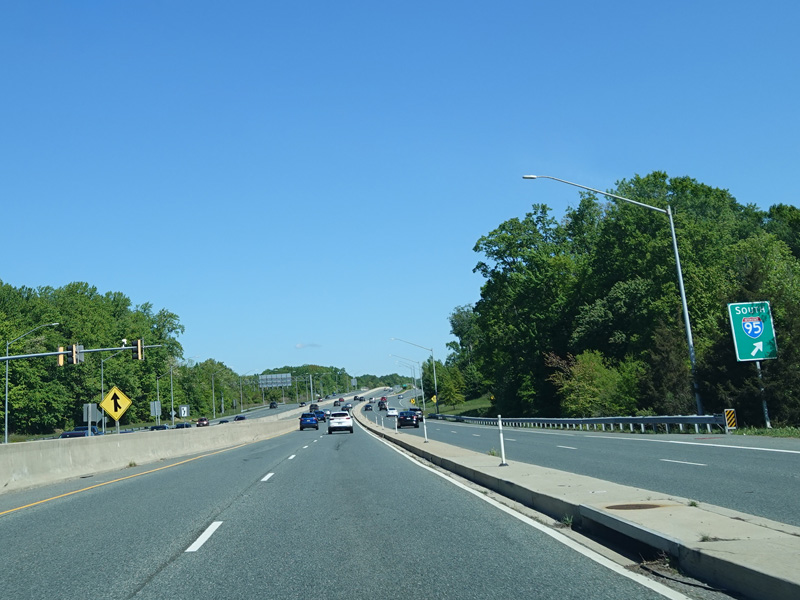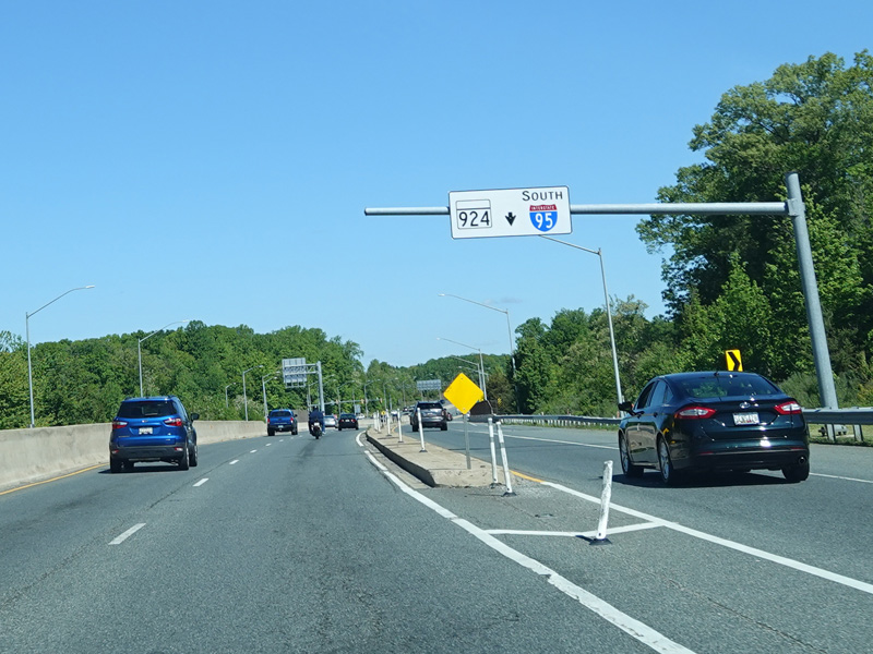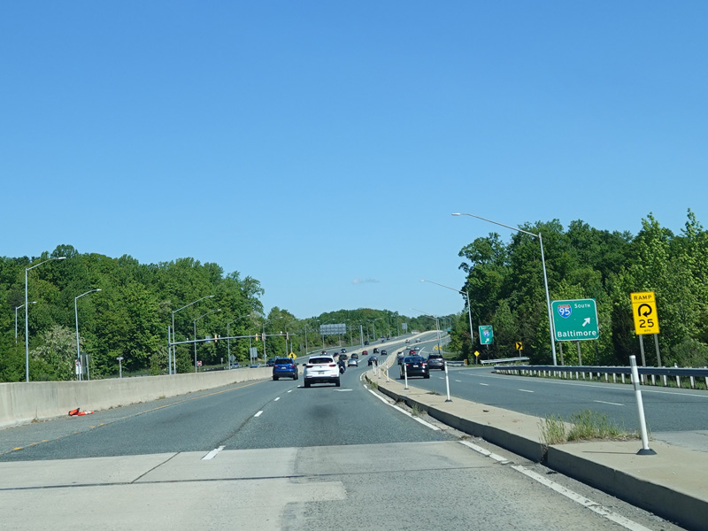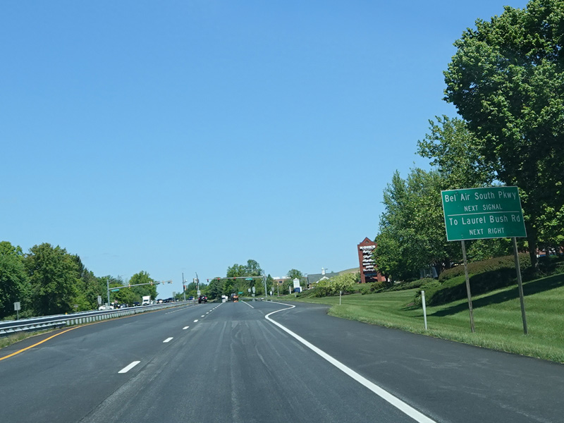 The roadway splits. Bear right for a service road leading to Emmorton Road (MD 924) and the John F. Kennedy Memorial Highway (I-95) south.