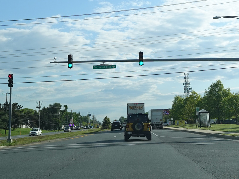 Welcome to Maryland! Fletchwood Road (MD 277) begins on the right at a traffic light. There is no signage for the state line.