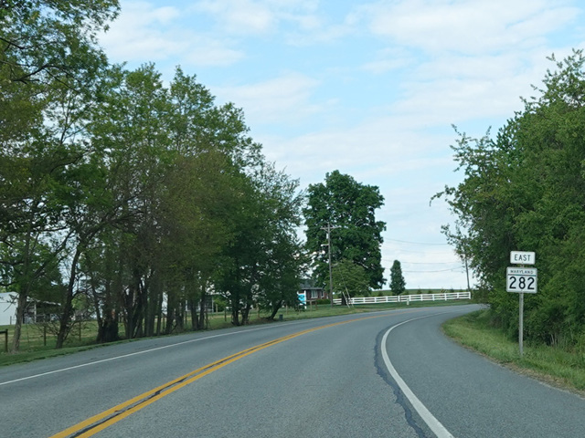 MD 282 is an east/west route on the Eastern Shore. Crystal Beach Road takes on the MD 282 designation in Earleville. It runs east to Cecilton, where it is known as Main Street. Heading out of town, it becomes Cecilton Warwick Road. It continues east to Warwick, where it is known as Main Street again. At the border with Delaware, it becomes Warwick Road (DE 299).