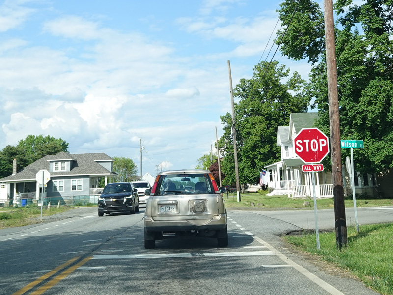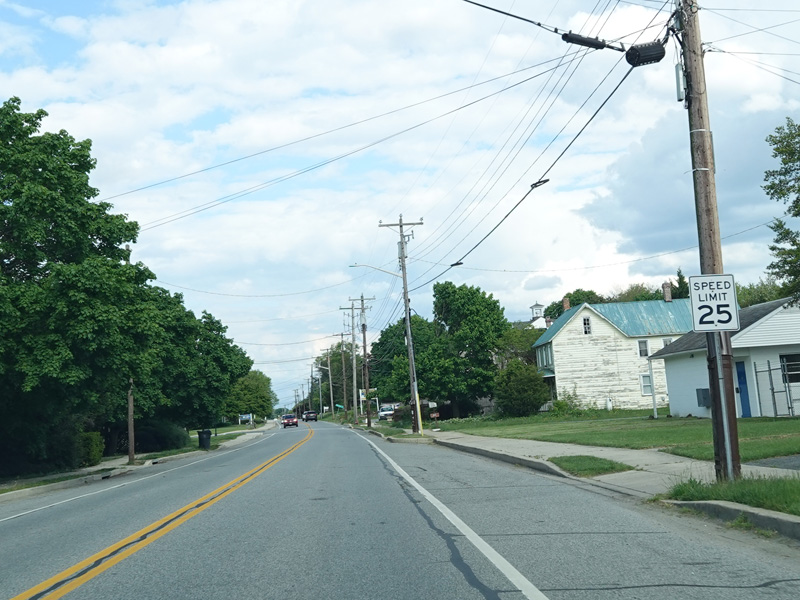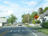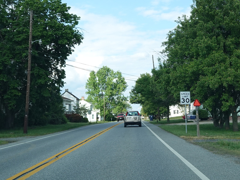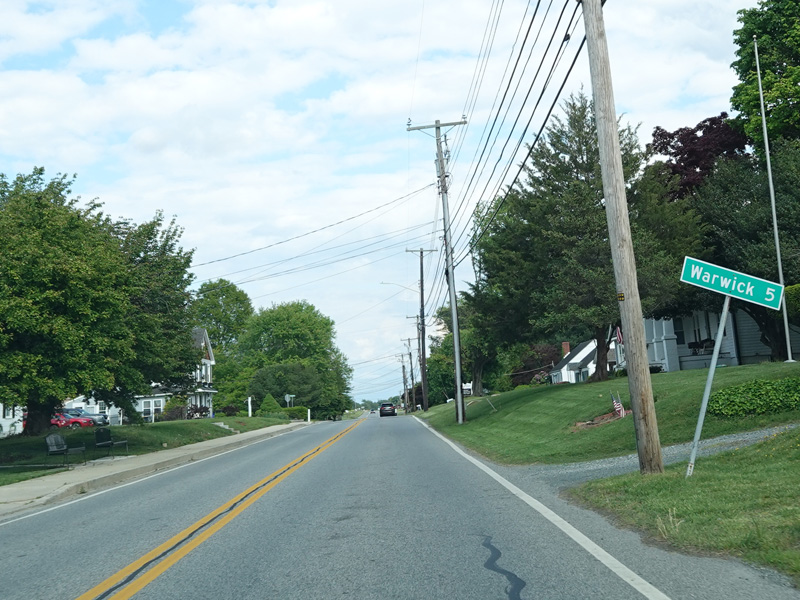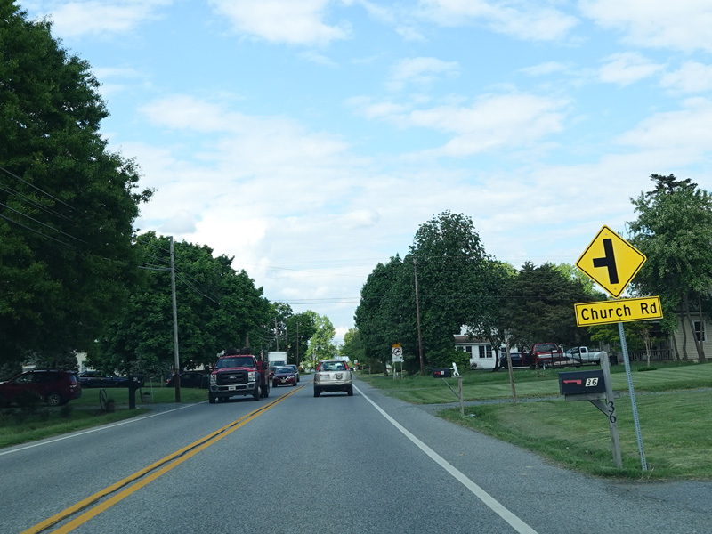 Coming into Warwick, MD 282 changes names to become Main Street again. There is an uncontrolled intersection at Church Road.
