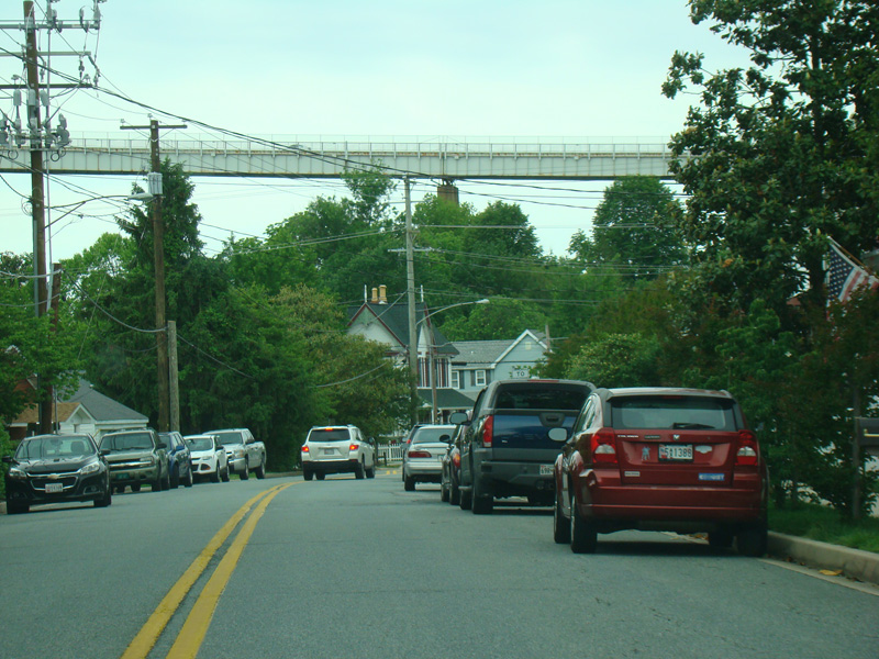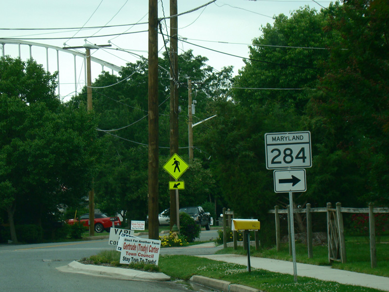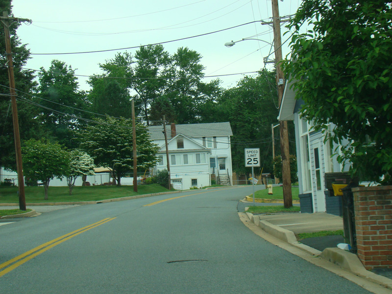 Lock Street ends at a stop sign at Augustine Herman Highway (MD 213). Turn left to go north or right to go south.