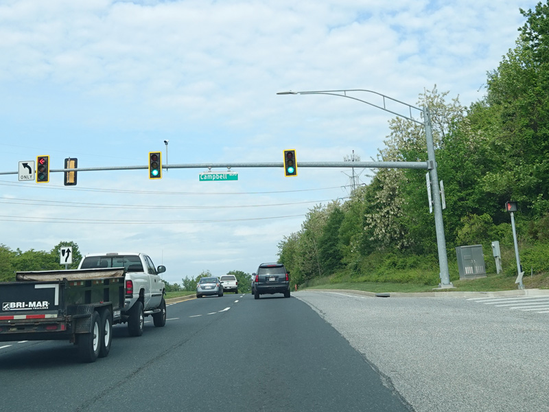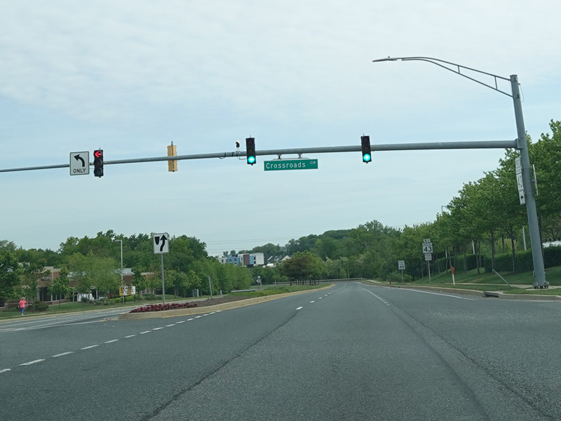 White Marsh Boulevard curves to the west and passes through Baltimore Crossroads. There are traffic lights at Crossroads Circle and Greenleigh Avenue.