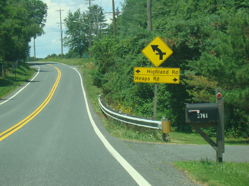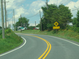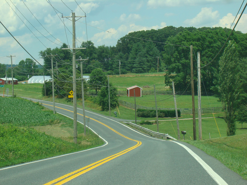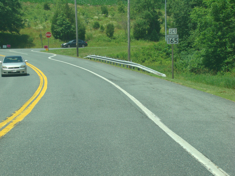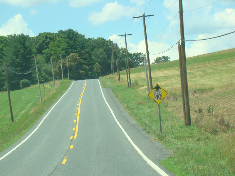 The speed limit drops to 40 MPH. There is an uncontrolled intersection at Old Pylesville Road, and then Ady Road ends at a stop sign at Pylesville Road (MD 165). Turn right to go north or left to go south.