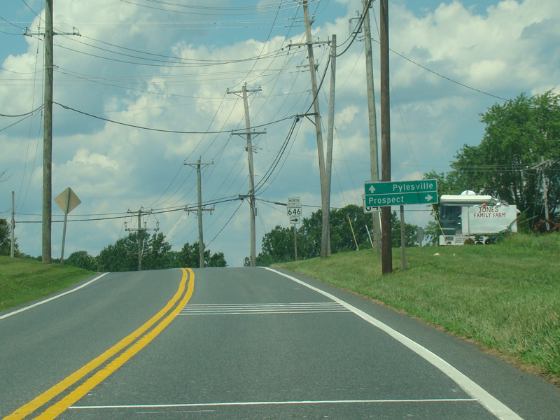 Ady Road runs north as a two-lane undivided road. There are uncontrolled intersections at Cherry Hill Road, Prospect Road (MD 646), Doyle Road, Taylor Road, Highland Road, Heaps Road, and Heaps School Road.