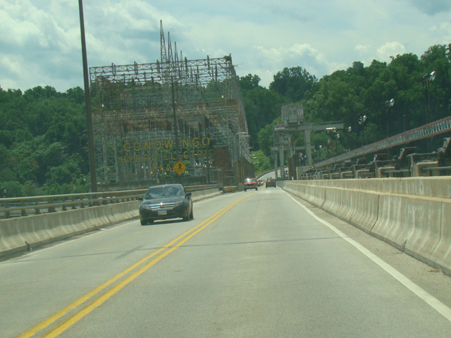 In Bel Air, US 1 becomes the Bel Air Bypass, a four-lane divided highway with a mixture of traffic lights and grade-separated interchanges. It eventually changes names to become the Hickory Bypass. Then, the highway peters out, narrowing down to become a two-lane undivided road called Conowingo Road. US 1 follows Conowingo Road to the northeast, crossing the Susquehanna River via a bridge at the Conowingo Dam. It eventually reaches Rising Sun near the border with Pennsylvania, where it is known as the Rising Sun Bypass, still a two-lane undivided road. US 1 continues across the state line into Pennsylvania.