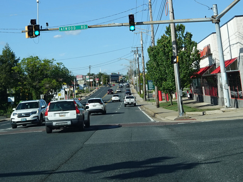 Baltimore Pike runs northeast through the downtown area of Bel Air. There is a traffic light at Atwood Road.