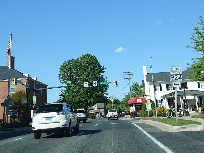 Baltimore Pike splits into a pair of parallel one-way streets as it ends at MD 924, which is also routed along a pair of parallel one-way streets here. Turn right onto Kenmore Avenue at the first traffic light to go south. Turn left onto Main Street at the second traffic light to go north and to stay on Business US 1. Fulford Avenue (MD 22) begins straight ahead.