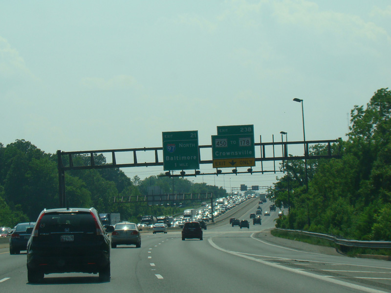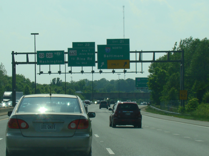 Exit 21 is for I-97 north. Exit 22 is for Aris T. Allen Boulevard (MD 665).