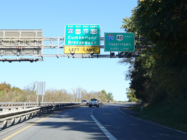 US 522 is a major north/south route extending from Powhatan, Virginia, to Selinsgrove, Pennsylvania. It passes through Maryland at the state's narrowest point at Hancock, where it is only two miles from West Virginia to Pennsylvania. It enters Maryland from West Virginia on a bridge over the Potomac River. There is a single exit for Main Street (MD 144), and then the highway ends an interchange with I-70. US 522 follows I-70 across the state line into Pennsylvania. The official mileage for US 522 in Maryland, as shown above, does not include the portion that is multiplexed with I-70.