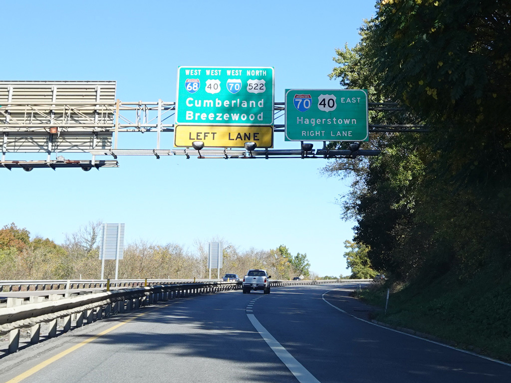 US 522 merges into I-70, and the two routes are multiplexed for the short distance from here to the state line. It merges in as a new lane on the left that is exit only for the National Freeway (I-68), which begins here. Signage before the merge advises motorists to move to the right to stay on I-70/US 522.