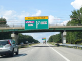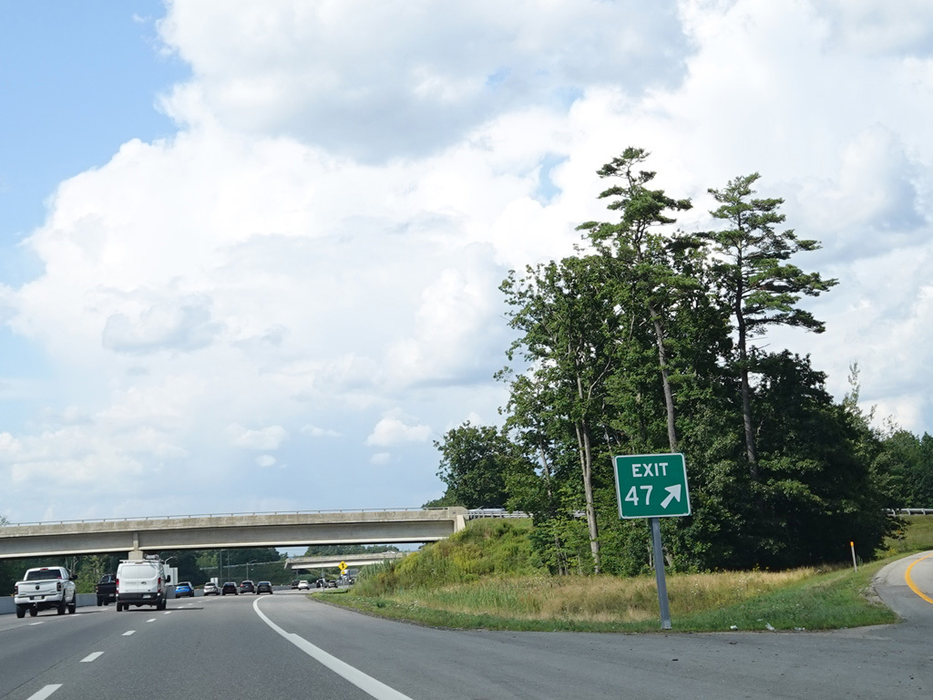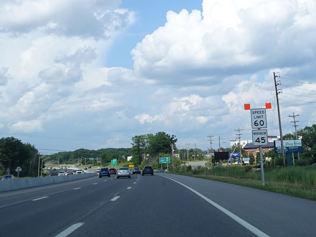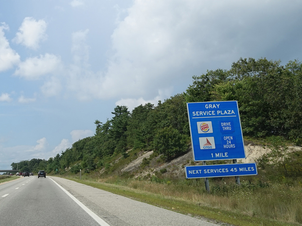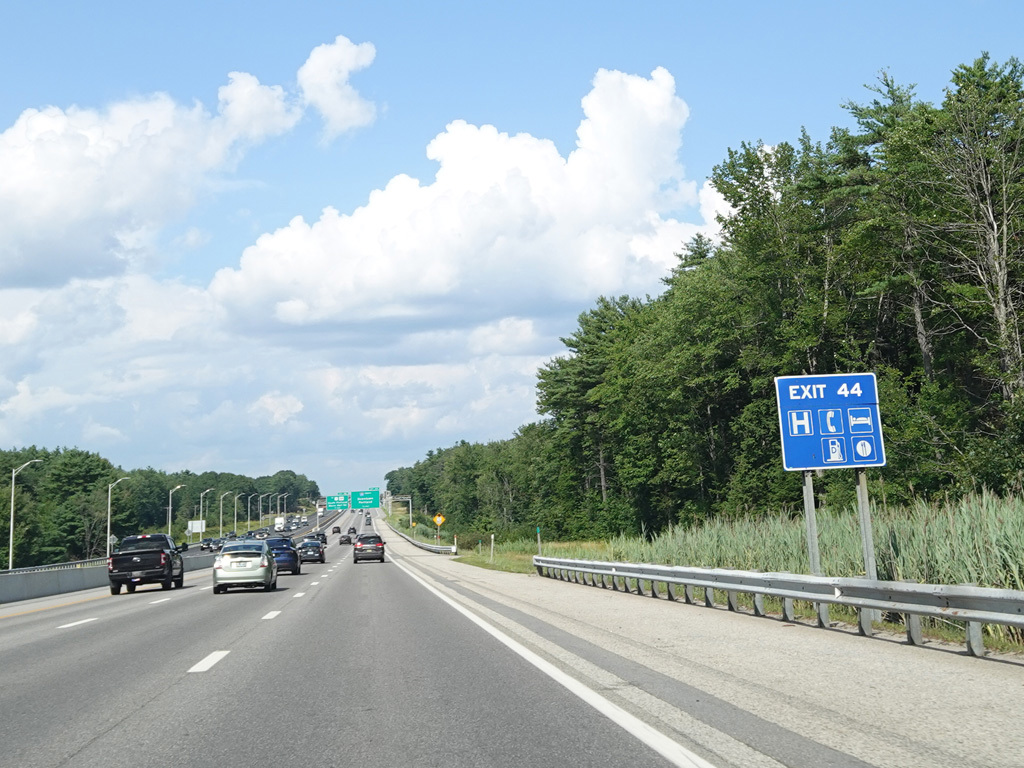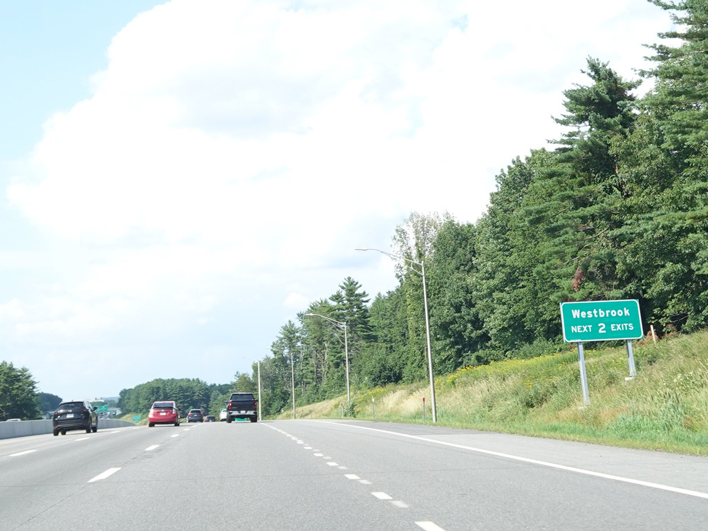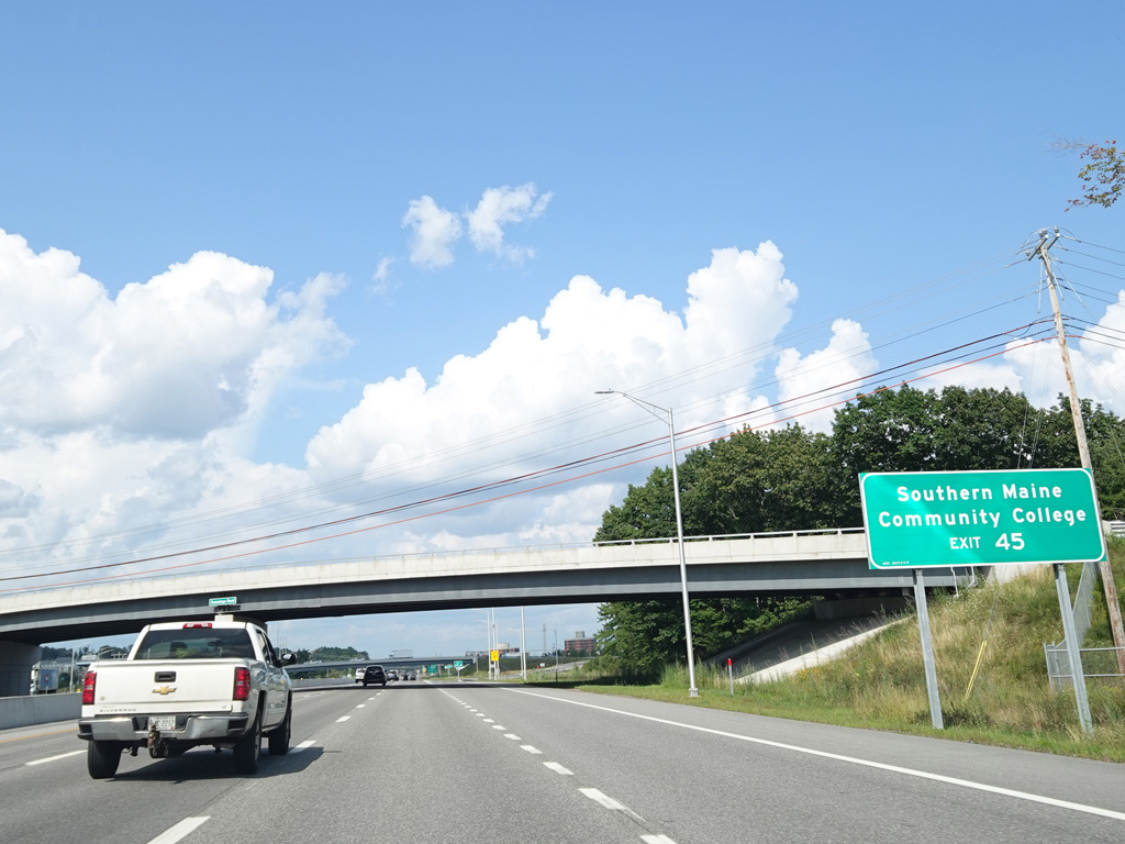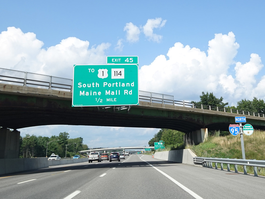 Exit 45 is for Main Street (US 1), Gorham Road (ME 114), and Maine Mall Road. The exit leads to the Maine Turnpike Approach Road (ME 703), which in turns provides access to all of the above roads.