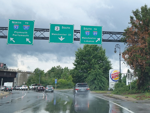 US 3 is a north/south route in Massachusetts and New Hampshire. The northernmost section in Massachusetts is an expressway. Upon entering New Hampshire, it becomes the Everett Turnpike, a toll highway through Nashua, Manchester, and Concord. US 3 follows the turnpike through Nashua and then splits off to follow the surface roads. It serves a local alternative to the remainder of the Everett Turnpike, I-293, and I-93. In Tilton, it crosses I-93 and runs east toward Lake Winnipesaukee. It runs along the west side of the lake and then curves back to the east toward I-93.