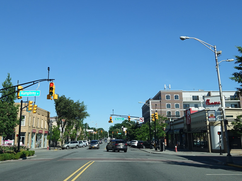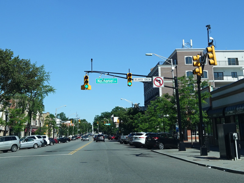 There are traffic lights at North Van Brunt Street, South Van Brunt Street, Humphrey Street, Nathaniel Place, and William Street.