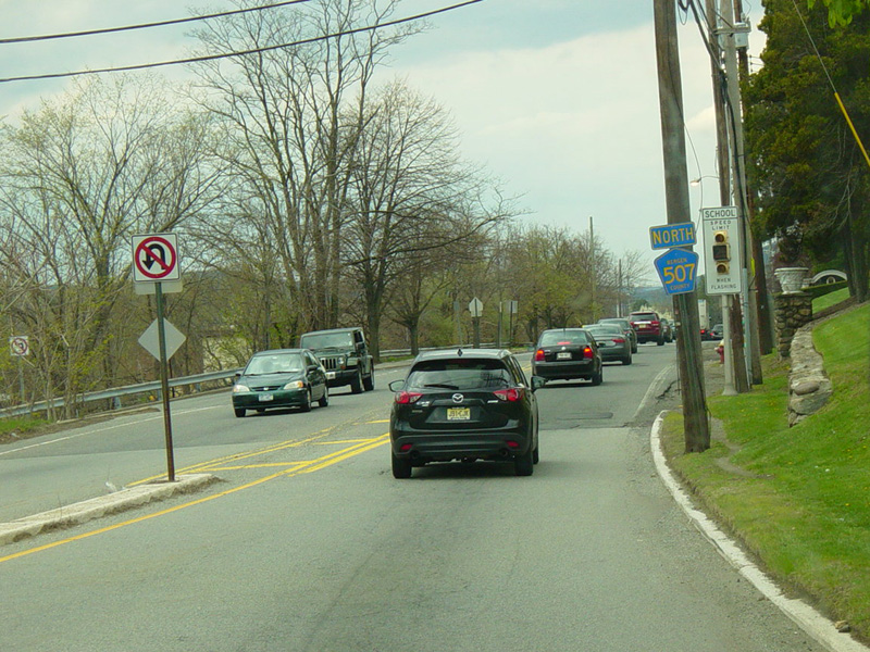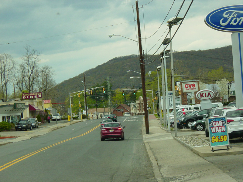 Franklin Turnpike ends here at the New York-New Jersey state line. Orange Avenue (US 202) is straight ahead in New York. Turn left to go south on Ramapo Valley Road (US 202) and remain in New Jersey.