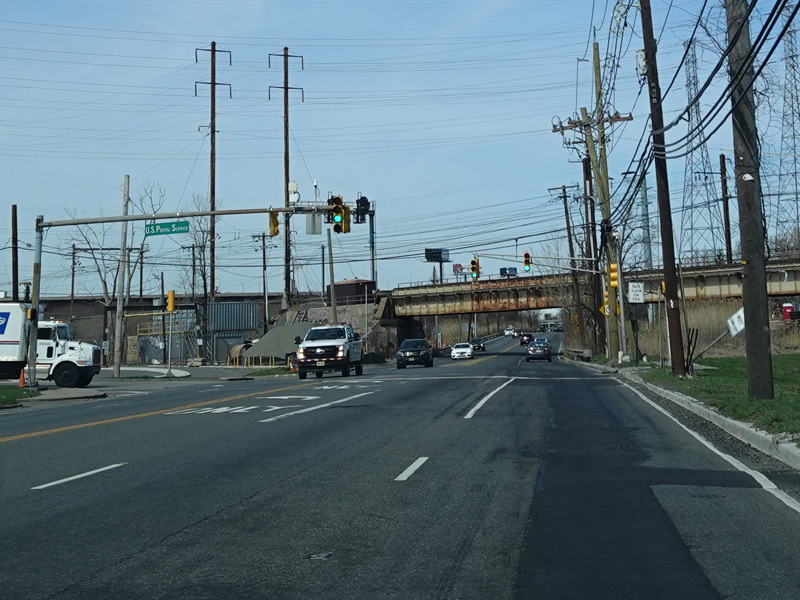 The divider ends, and Newark-Jersey City Turnpike runs west as a four-lane undivided road. There are traffic lights at Freeman Drive and the entrance to a United State Postal Service facility.