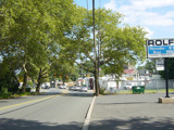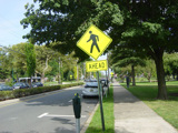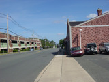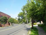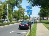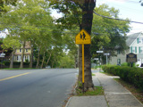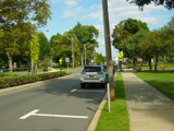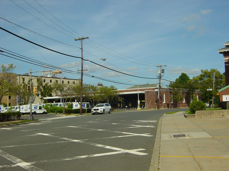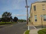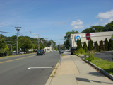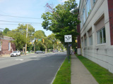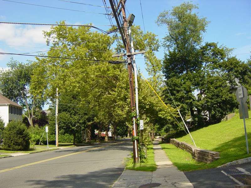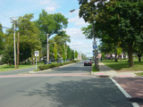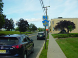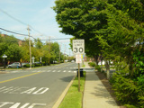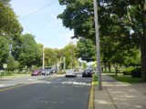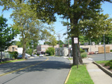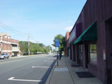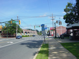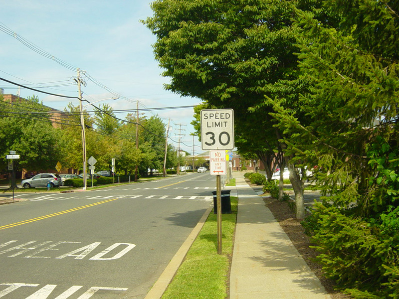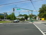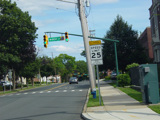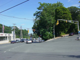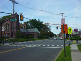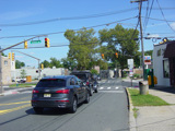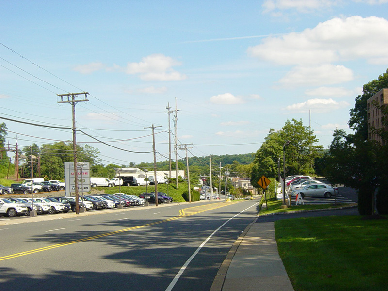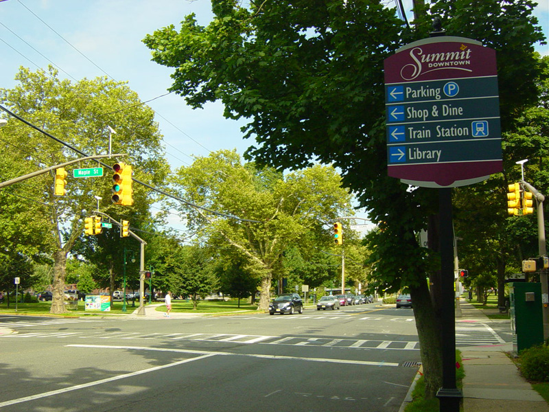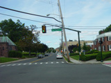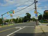 The median ends. Heading out of town, Broad Street goes down a sizeable hill. They call this place Summit for a reason! There is a traffic light at Ashwood Avenue.