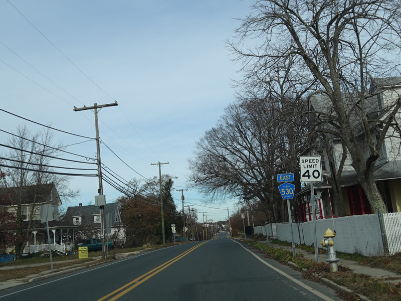 CR 530 ends here at a stop sign. All vehicles must turn left to go north on NJ 166.
