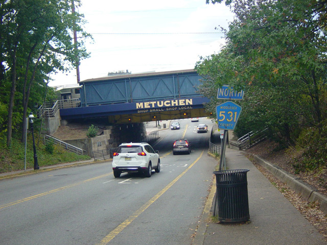 CR 531 is a north/south route from Edison to Long Hill. It begins at Woodbridge Avenue (CR 514) and runs north through Metuchen. The first section is known as Main Street. At the end of Main Street, CR 531 turns west onto Plainfield Avenue and follows it for a few blocks to where it ends at Central Avenue (Middlesex CR 669) and Plainfield Road. CR 531 turns north onto Plainfield Road for a little over half a mile and then west onto Park Avenue, which turns to the north after about half a mile. Park Avenue runs north to Watchung, where it ends at a traffic circle at Mountain Boulevard (CR 527) and Valley Road (CR 527). North of the circle, CR 531 is known as Hillcrest Road. It runs north to a small bridge over the Passaic River, where it changes names to become Mountain Avenue. A short distance north of the river, CR 531 ends at Valley Road (CR 512). Mountain Avenue continues north as Morris CR 638.