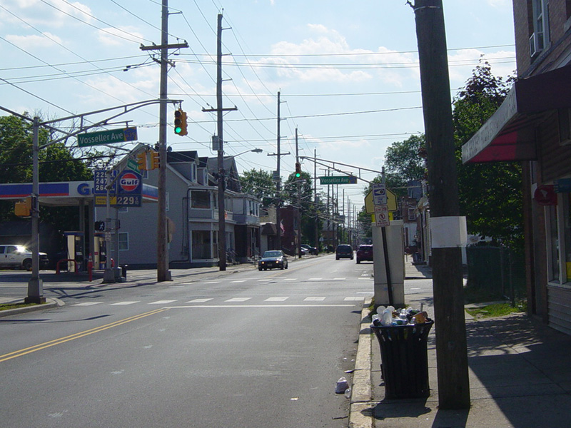 Talmage Avenue runs west as a two-lane undivided road. There is a traffic light at Vosseller Avenue (CR 635).