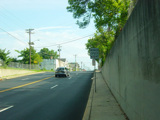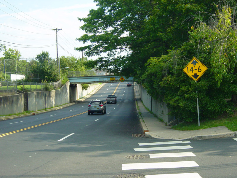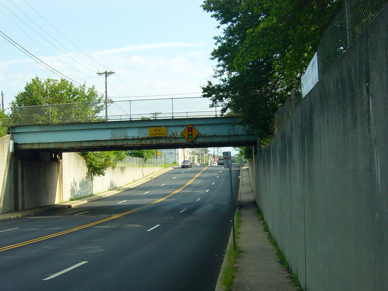 First Avenue widens to four lanes. There is an overpass carrying the Raritan Valley Line of New Jersey Transit over it.
