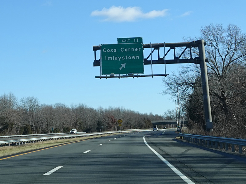 Exit 11 is for Coxs Corner and Imlaystown. The exit leads to Imlaystown-Hightstown Road (CR 43), but only the town names are posted.
