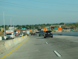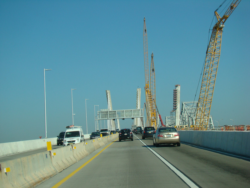These pictures were taken during the construction to replace the bridge. At the time, traffic in both directions was routed over what is now the eastbound span while the westbound span was being built.