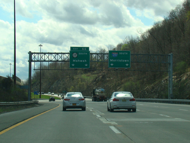 I-287 is a semicircular expressway looping around New York City at about a 25-mile radius. It begins in Edison at the New Jersey Turnpike (I-95) and the approach to the Outerbridge Crossing (NJ 440). It runs west to Somerville, where it begins to curve to the north and then to the northeast. It has interchanges with I-78 and the Bergen-Passaic Expressway (I-80). It continues northeast to Mahwah, where it crosses the border into New York. Just over the border, it curves to the east and merges with the New York Thruway (I-87). I-287 is signed as a north/south route in New Jersey and as an east/west route in New York.