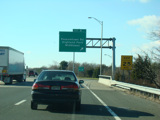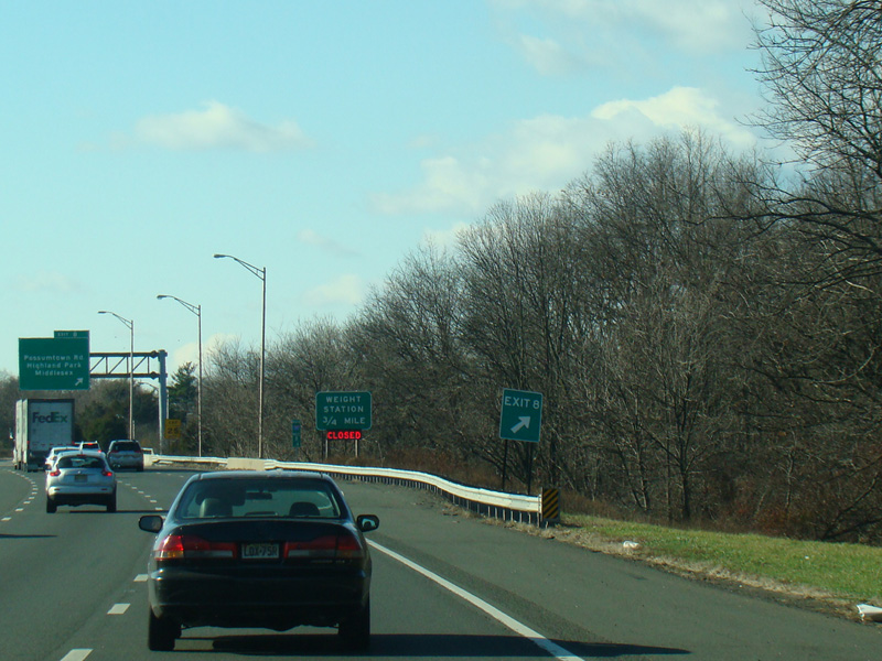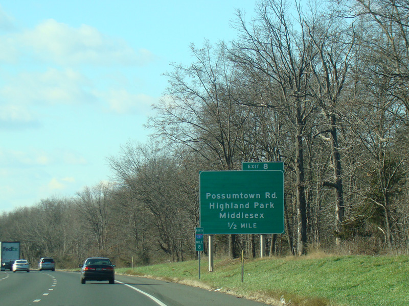 These pictures show the signage for exit 8 as it appeared before Hoes Lane, Centennial Avenue, and Possumtown Road were upgraded to become part of NJ 18. These signs are still standing, but NJ 18 shields have been added in the blank space at the top.