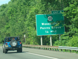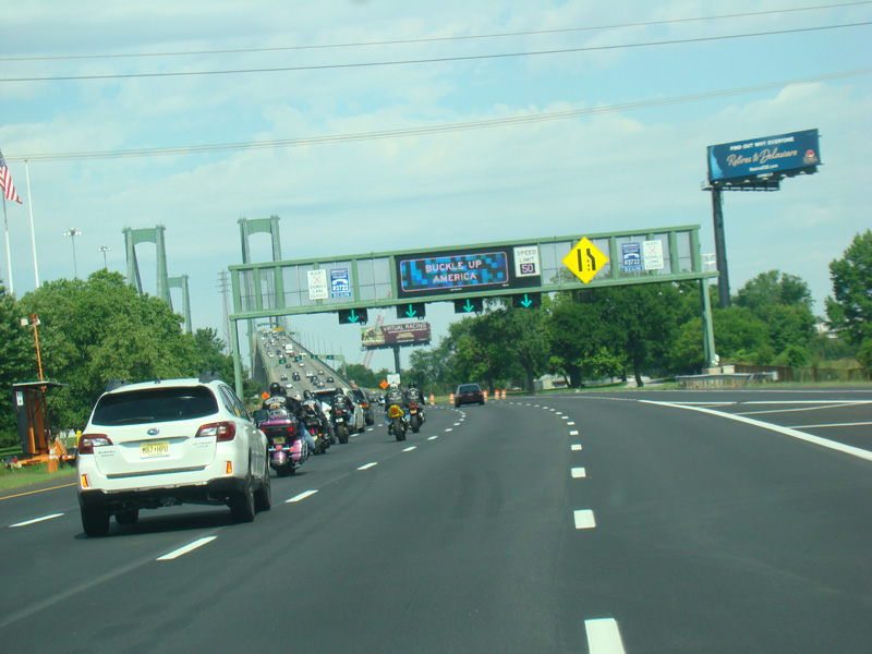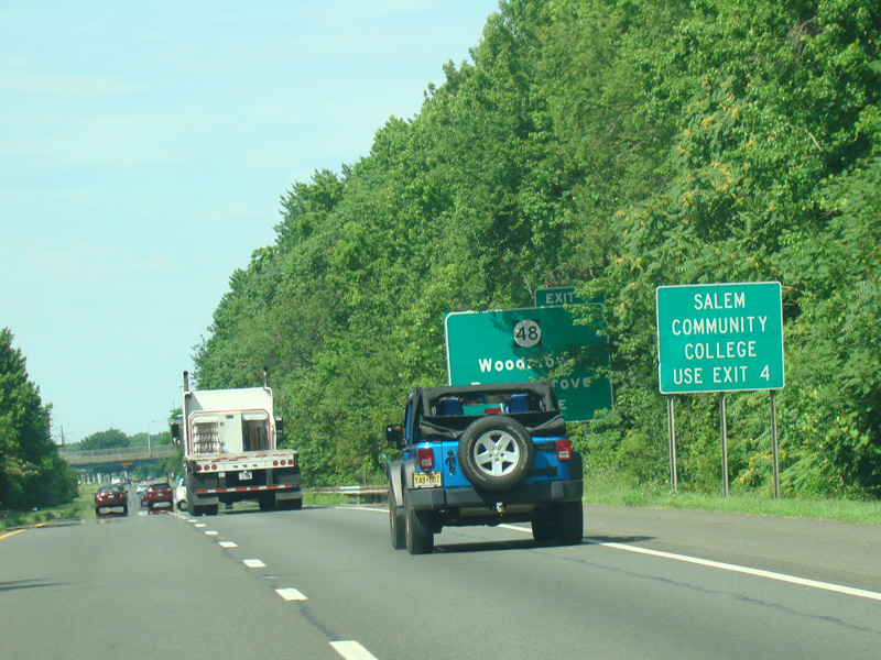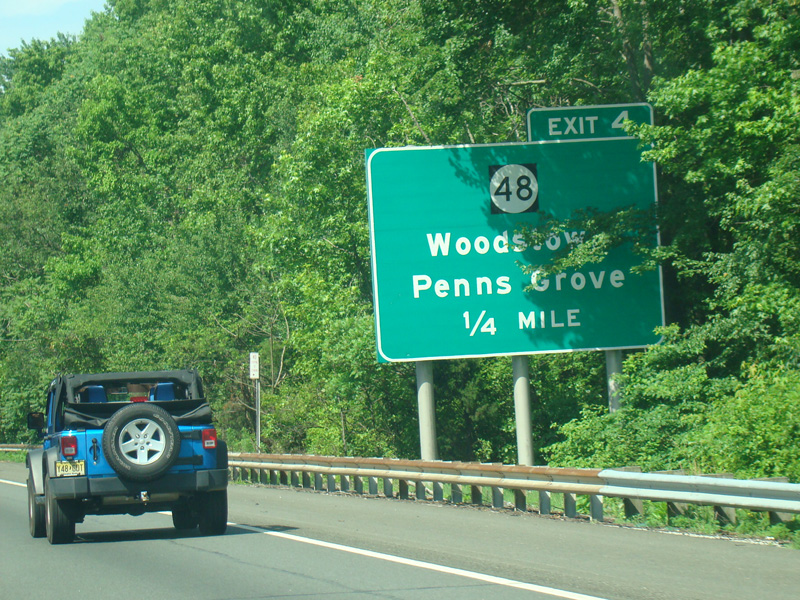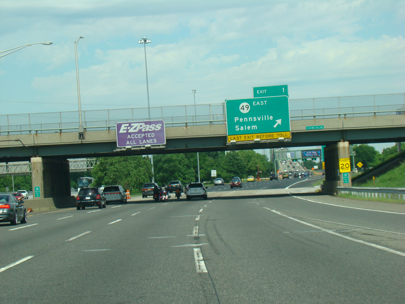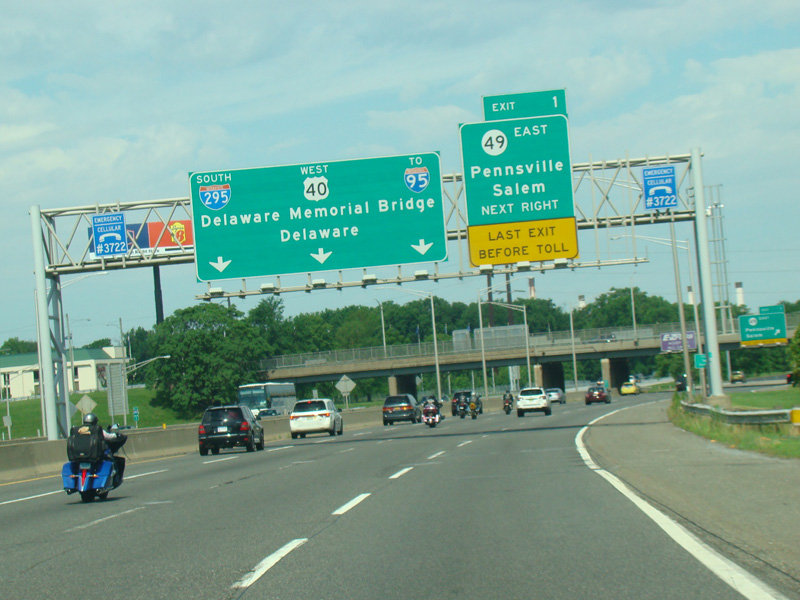 The New Jersey Turnpike (NJ 700) merges in from the left. Exit 1 is for NJ 49 east. It is the last exit in New Jersey. I-295 continues straight ahead across the Delaware Memorial Bridge into Delaware.