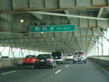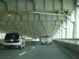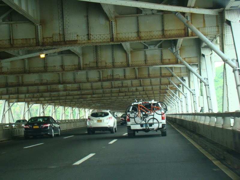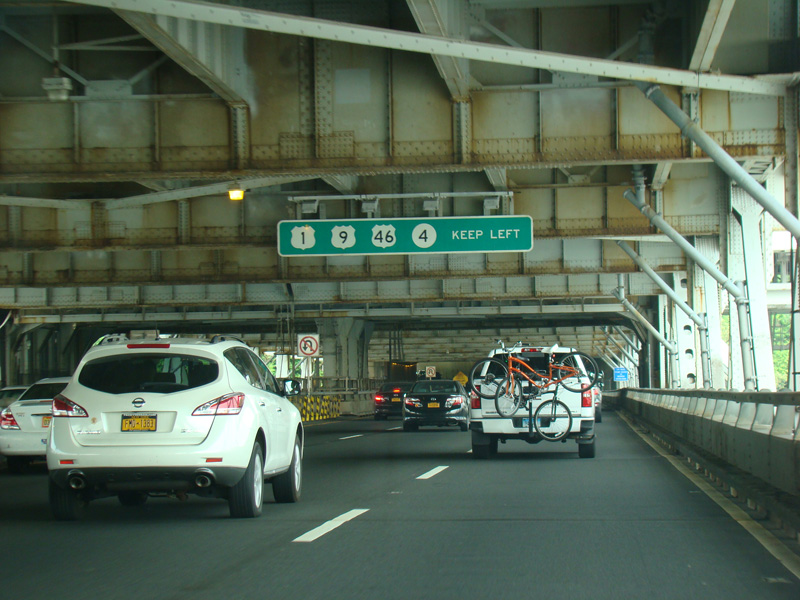 The George Washington Bridge crosses the Hudson River from New York to New Jersey. On the lower level, there are small overhead signs for the exits on the other side of the bridge.