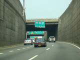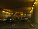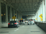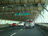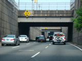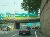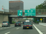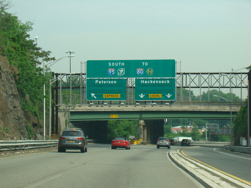 The turnpike splits into two separate sets of lanes, the express lanes and the local lanes. The express lanes provide access to only the most major exits, while the local lanes provide access to all exits. This lane configuration only exists on the turnpike from here to the beginning of I-80, which also has express and local lanes. The lanes coming from the lower level of the bridge become the local lanes straight ahead. Bear left for a crossover to the lanes coming from the upper level, which become the express lanes.