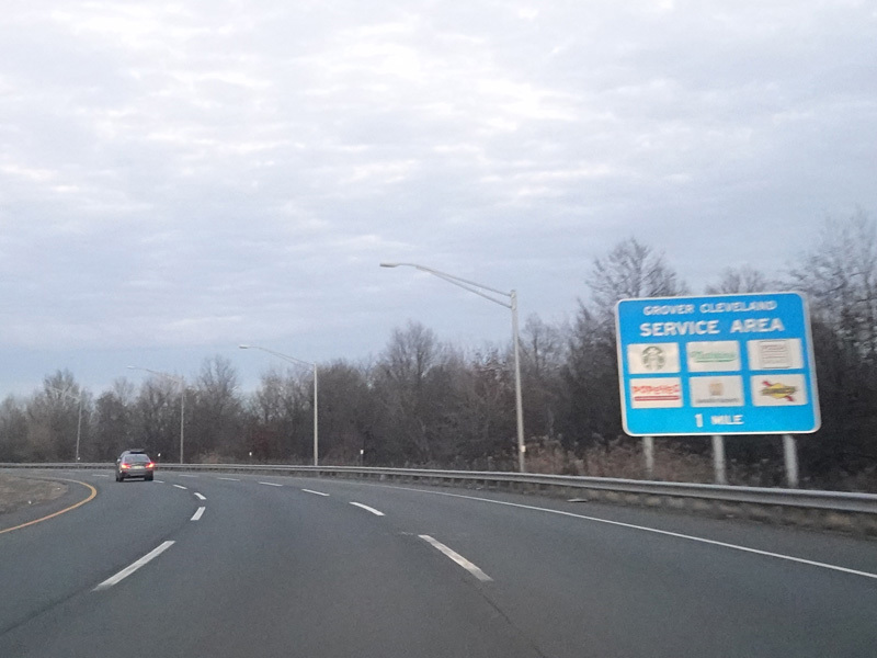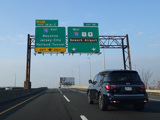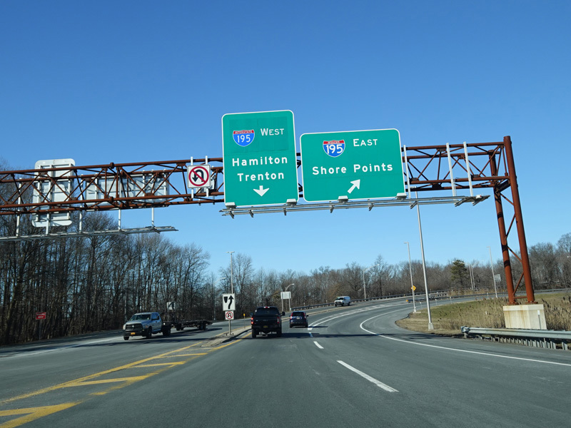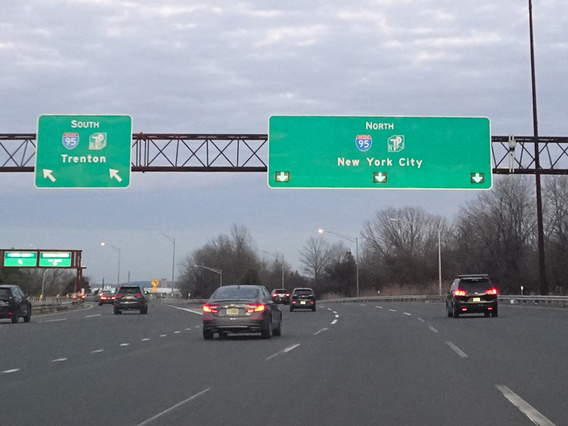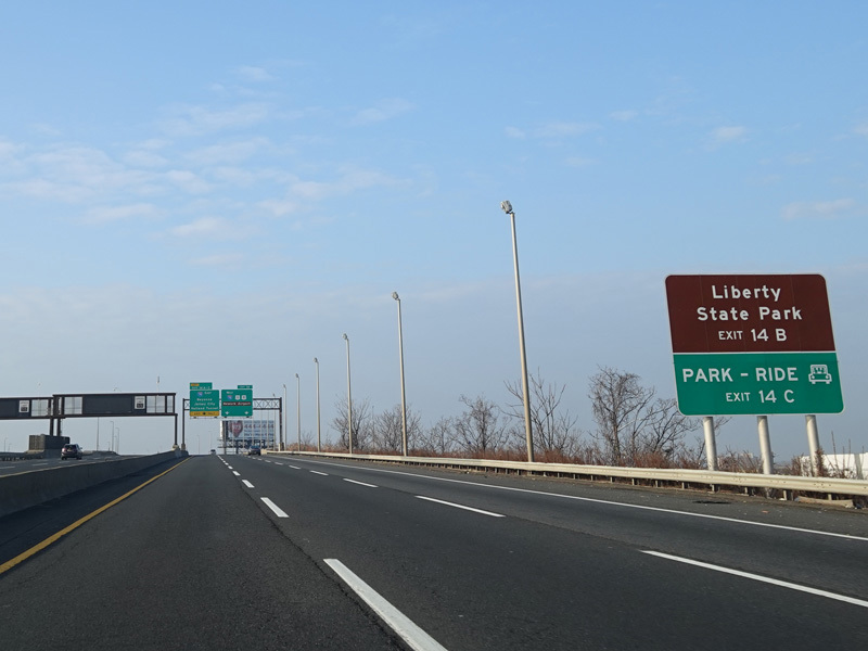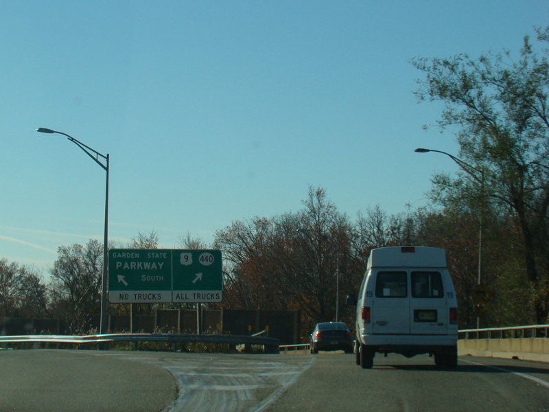 The ramp for exit 11 splits twice after the tollbooth. Bear right at the first split for the Garden State Parkway (NJ 444) north. Bear left at the second split for the Garden State Parkway (NJ 444) south. Continue straight ahead for US 1, US 9, and NJ 440.