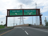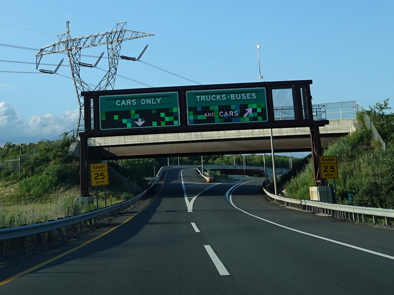Vehicles entering the turnpike southbound from I-78 pass through this ramp, which splits. Bear left for the car lanes or right for the truck lanes. There is no tollbooth along the ramp because I-78 becomes the Newark Bay Extension of the turnpike at the point where it crosses the mainline, so all motorists must get a ticket at a tollbooth at on I-78 in order to reach this ramp.