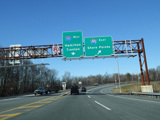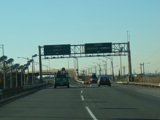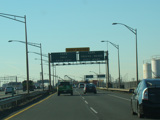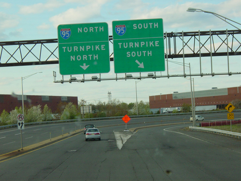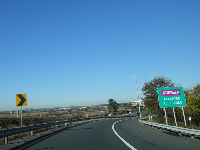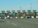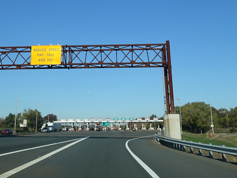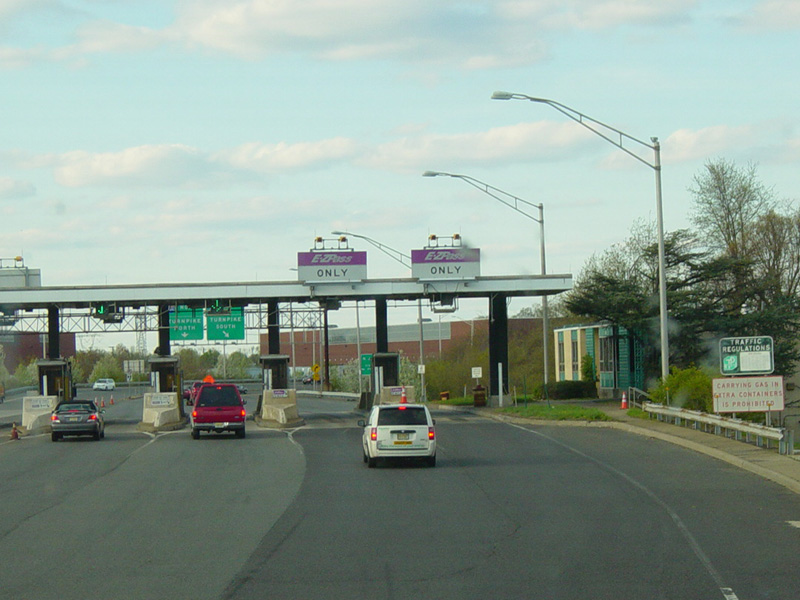 Motorists entering the turnpike at exit 8A pass through this tollbooth. Those who do not have E-ZPass must take a ticket indicating where they got on the turnpike. After the toll, the ramp splits. Bear left to go north or right to go south.