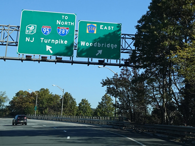 The ramp for exit 10 splits four times after the tollbooth. Bear right at the first split for Woodbridge Avenue (CR 514) west. Bear right at the second split for the Outerbridge Crossing (NJ 400) north. Bear right at the third split for Woodbridge Avenue (CR 514) east. Bear right at the fourth split for I-287 north. Bear left all four times to get back on the turnpike.