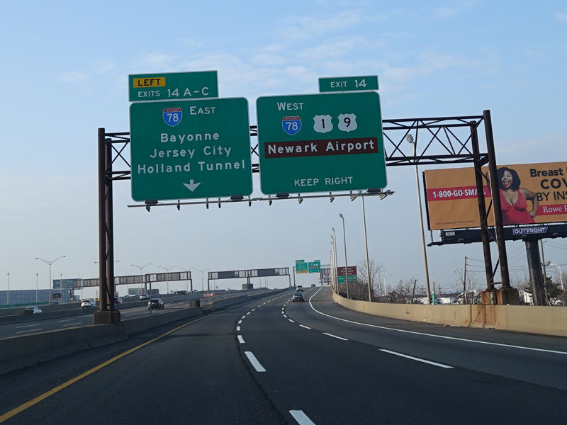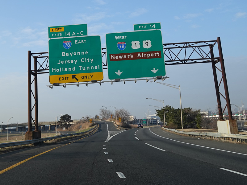 The ramp for exit 14 and exits 14A-C splits. Bear right for exit 14, which is for I-78 west, US 1/US 9, and US 22. Bear left to go east on I-78, which beginning here is the Newark Bay Extension of turnpike. Exits 14A-C are exits from the turnpike extension, which is a bit confusing, but this is New Jersey.